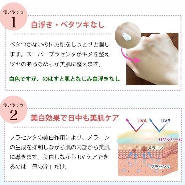 化粧下地としてもご使用頂ける、ウォータープルーフタイプのUVクリーム。 スーパープラセンタをはじめ、美容液のような成分がお肌を潤し、優しく守ります。