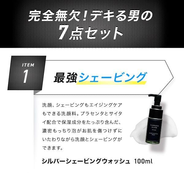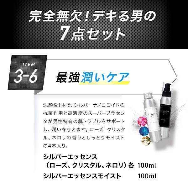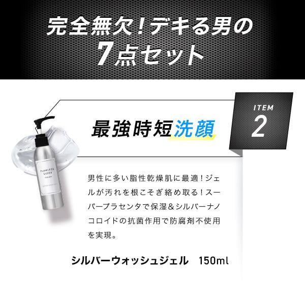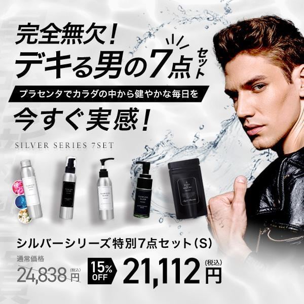 内容量:シルバーエッセンス:100ml/シルバーエッセンス モイスト:100ml/シルバーウォッシュジェル:150ml/シルバーシェービングウォッシュ:100ml/プラセンタEX for MEN:250mg×60カプセル/袋
